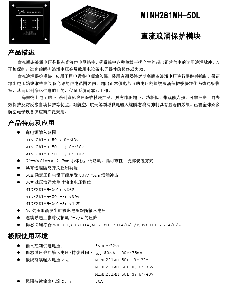 额定工作电压:28VDC,额定工作电流50A,过压浪涌保护模块,升级款。满足GJB298、GJB181、DO-160E等系列标准。