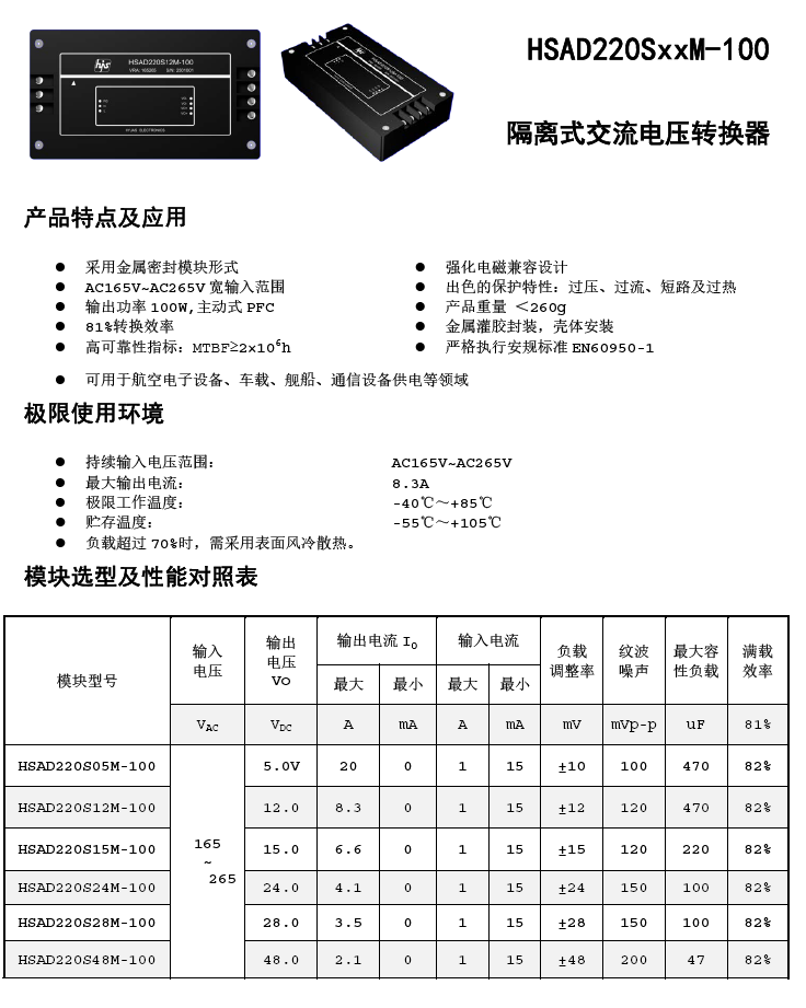 AC165~265V宽电压输入范围,隔离输出5V、12V、15V、24V、28V、48VDC可选 ,100W输出功率,转换效率82%,全国产。