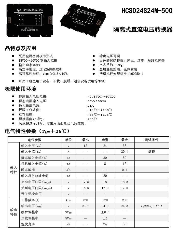 HCSD24S24M-500 隔离式直流24V输入转直流24V输出电源模块(500W)