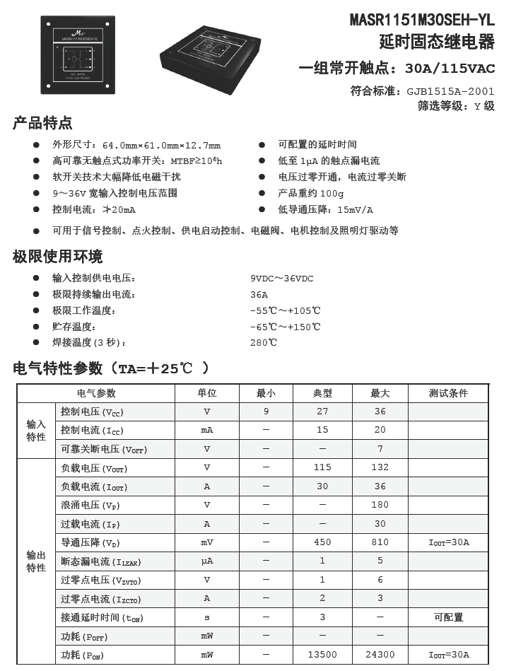 MASR1151M30SEH-YL 交流115V/30A单相延时固态继电器