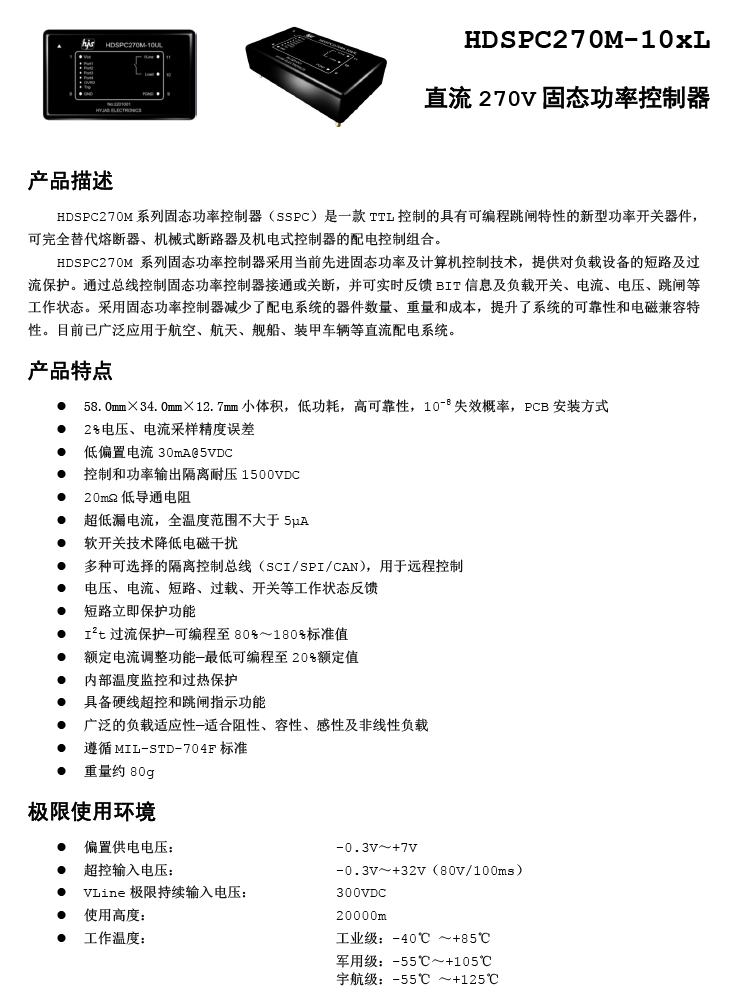 高压直流SSPC。额定DC270V/10A,偏置电压DC5V,具备短路立即保护,可编程反时限过载保护,智能负载识别,智能容性负载管理,精准电压电流采样上报,多种总线接口可选,PCB安装方式,全国产。