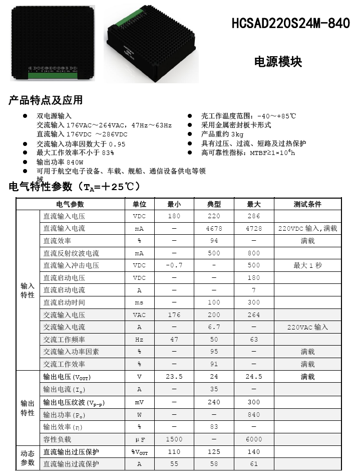 输入范围,隔离输出24VDC ,840W输出功率,最大工作效率不小于83%。