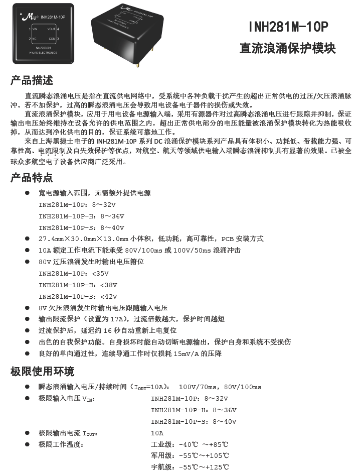 INH281M-10P 直流28V/10A限流过压浪涌保护模块