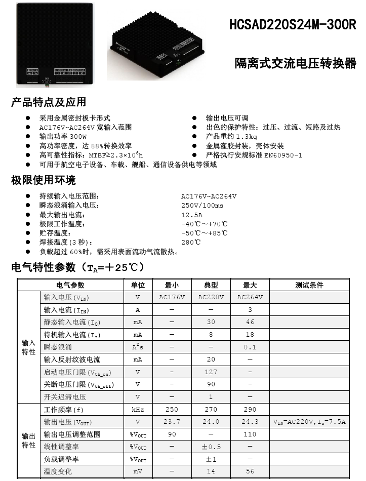 AC176~264V交流电压输入范围,隔离输出24VDC ,300W输出功率,88%转换效率,自带滤波、输入过载防护、过温保护,全国产。