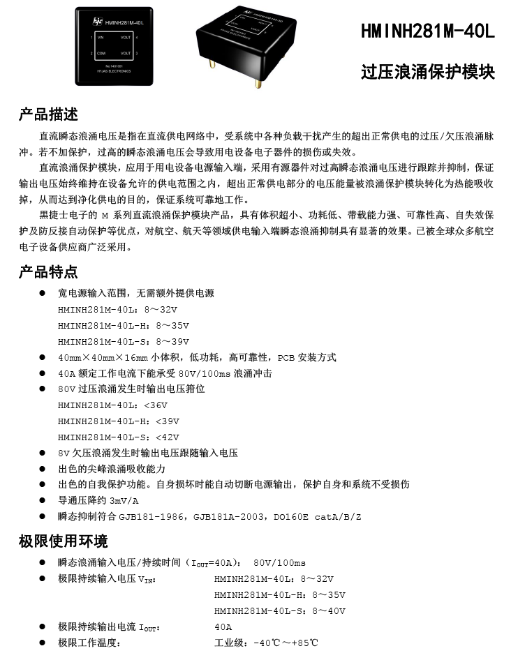 HMINH281M-40L 直流28V/40A全国产过压浪涌保护模块(II代)
