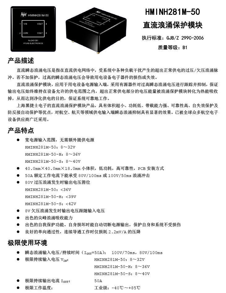 HMINH281M-50 直流28V/50A全国产过压浪涌保护模块(II代)