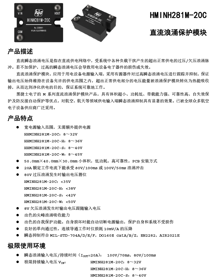 HMINH281M-20C 直流28V/20A全国产过压浪涌保护模块(II代)