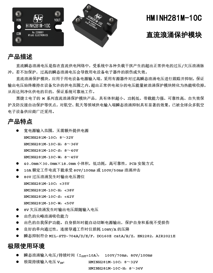 HMINH281M-10C 直流28V/10A全国产过压浪涌保护模块(II代)