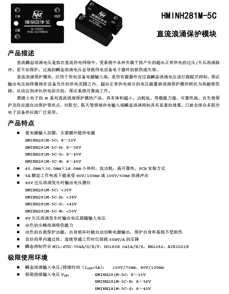HMINH281M-5C 直流28V/5A全国产过压浪涌保护模块(II代)